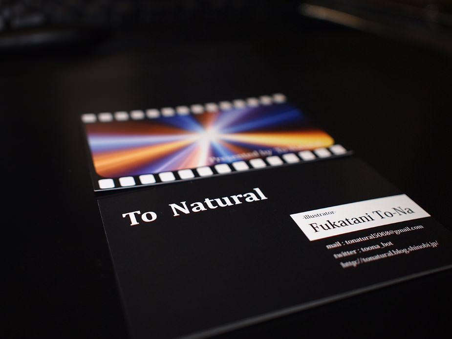 29 December C81直前更新 という訳でどうも深谷トーナです!コミケ一日目でしたね!参加された方々はお疲れ様でした!私の方は一日目は会社で納会を兼ねた旅行があったので参加はできませんでした(^_^;)それは置いておきまして今回の更新内容は『名刺』についてです。一年前に同人活動を始めてはいたものの名刺に関しては先送りにしまくっていたのですが、今回コミケ終了後クリエイターの方々との飲み会に参加させていただくことになり急ピッチでつくろうと思った次第です。しかし名刺なんてどうしたもんかいまいち分からずただただ時は過ぎもう名刺〆切に…。わからぬとなんて言ってられずにパパっと作ってしまいました。それが↓へへ…自分でイラストレーターなんて書いてしまったのだぜ…。しっくりこないのにも程がある!しかもイラストレーターと書いてるくせに裏面は本業はエフェクトとか作ってる人だからそれでやればいいかなーと思い、一番初めに覚えたエフェクトの一部を抜粋。そして動画の一部ということでフィルムっぽくイラレで簡単に作っておしまい。イラストレーターなのか動画系の人なのかよくわからん名刺になってしまいましたwでもまぁ…うん。どうせまたすぐ作りなおせばいいし…。なんやかんや言ってますが今回はこの名刺を持って行こうと思います。しかしこの写真。この前買ったデジタル一眼で撮ったんですがデジタル一眼はほんと面白いですね!色々ハマっちゃいそうです(´ސު`)これで後はロードバイク系の自転車さえ手に入れば何も文句はないですwしかし名刺も作りましたしこれからの挨拶回りは何も怖くない!というかむしろ配りたい!欲しい方なんていないと思いますが欲しいという物好きな方がいたら仰ってくだされば差し上げます。というか是非もらってください状態。以上です!また明日更新したいところですが出来るかなー?頑張ります!それでは!